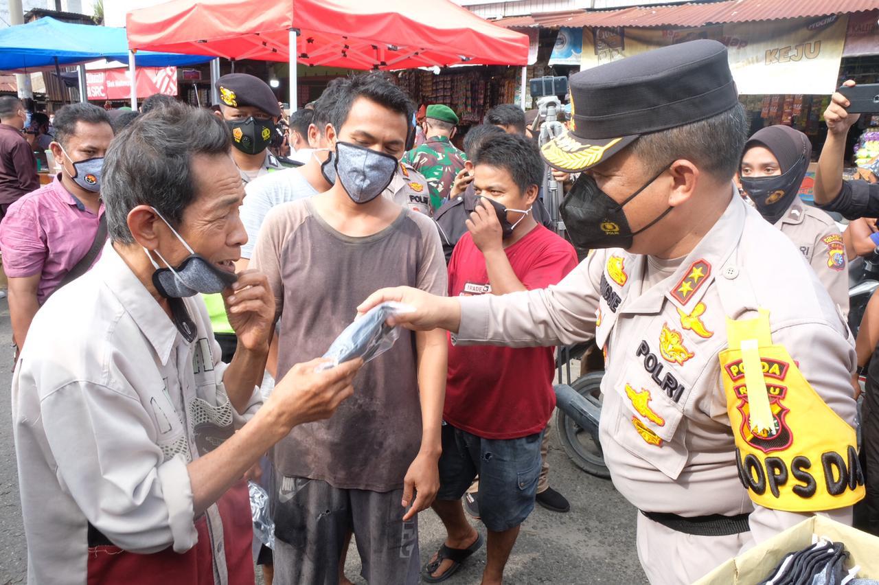 Kapolresta Kombes Pol H Nandang Mu'min Wijaya, S.I.K., M.H, ikut ambil bagian dengan melakukan pembagian masker kepada masyarakat di Pasar Senapelan atau Pasar kodim dan membagikan sembako kepada masyarakat yang tinggal sekita Pasar kodim tersebut.