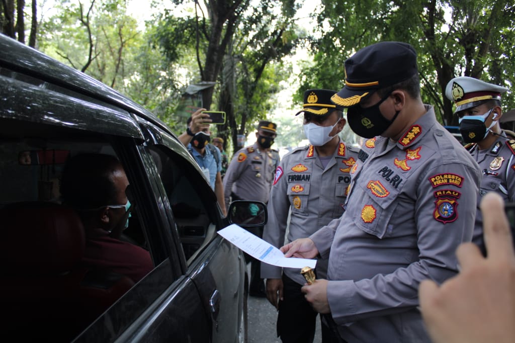 Kapolresta Pekanbaru Kombes Pol H. Nandang Mu'min Wijaya, S.I.K.,M.H bersama Dirlantas Polda RiauKombes Pol Firman Darmansyah serta Jajaran Polresta Pekanbaru melakukan pengecekan di pos-pos penyekatan jalur keluar masuk kota Pekanbaru, Selasa (27/07/2021