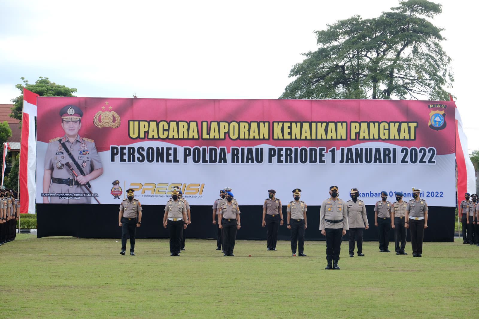 Upacara laporan kenaikan pangkat personel Polda Riau periode 1 Januari 2022, yang dilaksanakan di halaman kantor Mapolda Riau, Sabtu (1/1/2022) sore dipimpin langsung oleh Kapolda Riau, Irjen Pol Muhammad Iqbal.