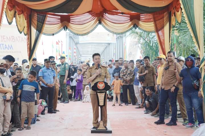 Bupati Rokan Hilir ( Rohil ), Afrizal Sintong SIP meresmikan pembangunan jembatan penyebarangan ke Kepenghuluan Air Hitam, Kecamatan Pujud, Selasa (18/7/2023)