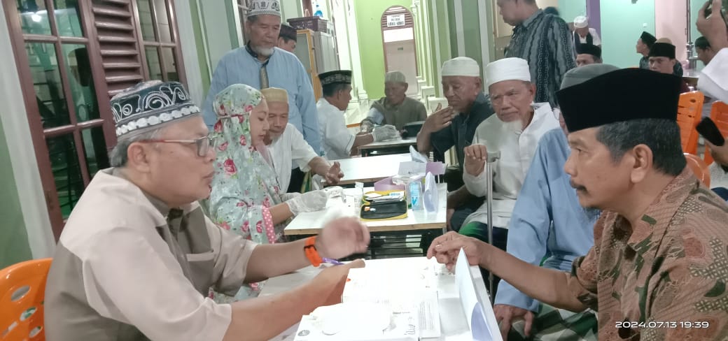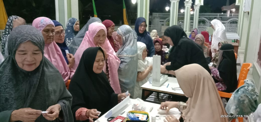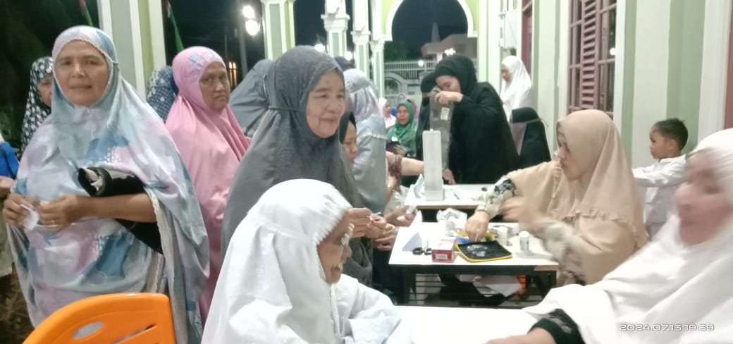 Pengurus Masjid Nurul Muhsinin melaksanakan pemeriksaan cek kesehatan secara gratis. Kegiatan itu, digelar di teras Masjid Nurul Muhsinin yang berada di Jalan Ikan Mas, Kelurahan Tangkerang Barat, Kecamatan Marpoyan Damai Sabtu (13/7/2024).