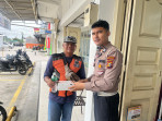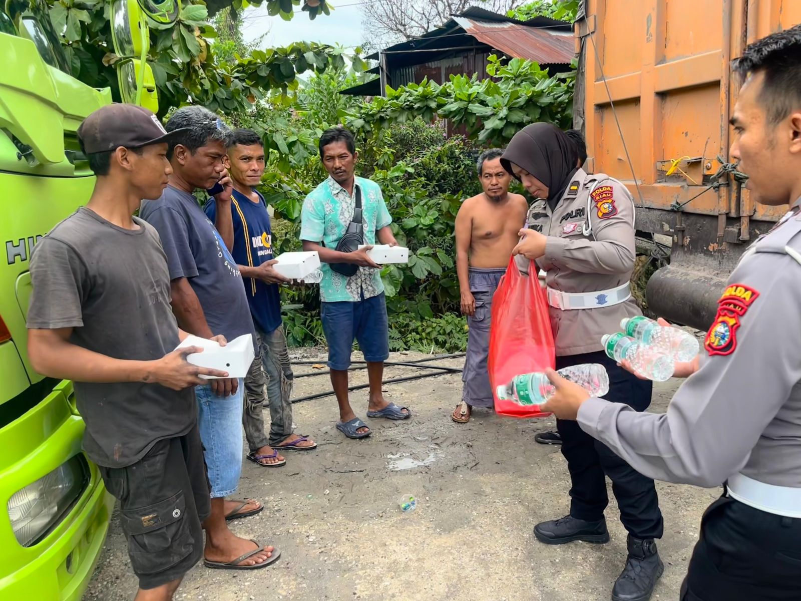 Personil Ditlantas Polda Riau melaksanakan cooling system dengan cara membagikan 200 nasi kotak kepada para petugas kebersihan jalan, tukang parkir serta para sopir-sopir angkutan barang saat di Jalan T Tambusai, Jum'at 11 Oktober 2024.
