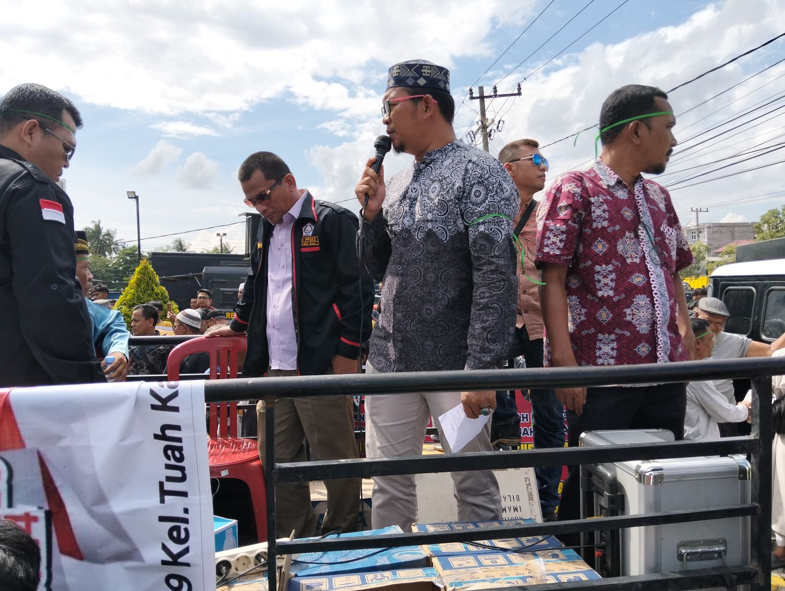 Ketua Forum Anti Maksiat (FAM) Tampan, Syariful, saat menyampaikan orasi dalam aksi demontrasi di Chromatic Karaoke Family. Jalan HR Soebrantas,Panam Jumat (20/12/2024).