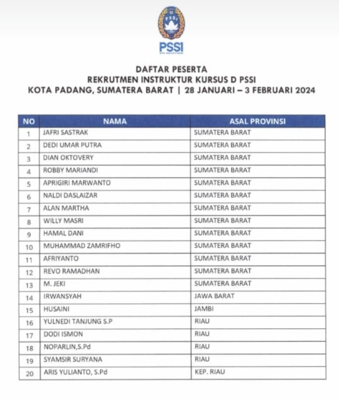 PEKANBARU--(KIBLATRIAU.COM)-- Berdasarkan surat pemanggilan PSSI untuk mengikuti kursus Instruktur Pelatih Licency "D" nomor : 429/UDN/246/I-2025 tgl 22 Januari 2025. Dimana pelaksanaan kursus ini digelar di Kota Padang dari 28 Januari s/d 3 Februari 2025, jumlah peserta sebanyak 20 orang., Masing-masing dari Sumbar 14 orang, Riau 4 orang, Jawa Barat 1 orang, Jambi 1 orang dan Kepri 1 orang.