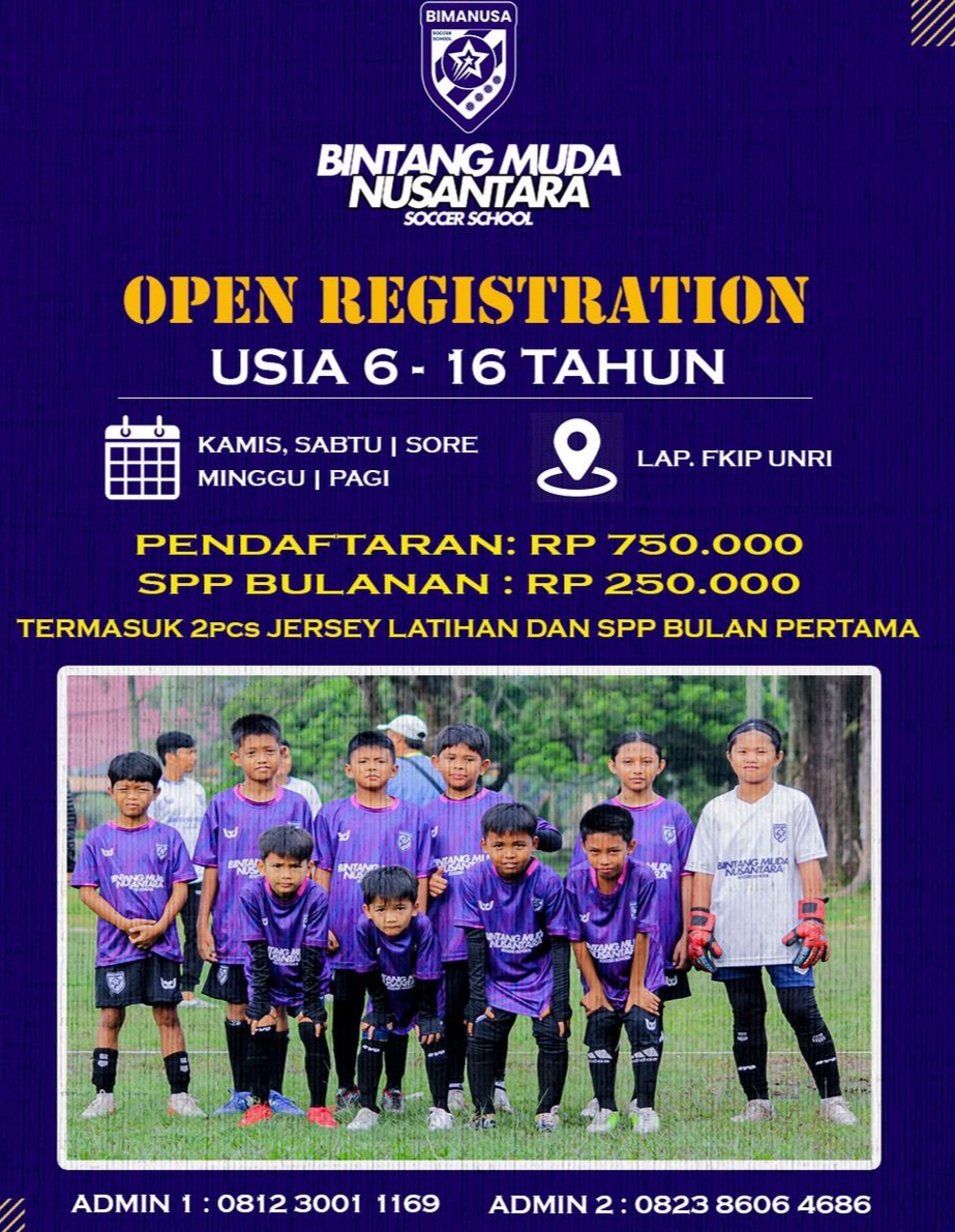 "Ya Alhamdulillah, Bimanusa Soccer School ini sudah berdiri sejak tanggal 25 Januari 2025 yang lalu.  Untuk tempat latihannya kita lakukan di lapangan FKIP UNRI dan jadwalnya Hari Kamis dan sabtu Jam 16.15 wib serta Minggu jam 07.30 Wib. Sementara itu untuk biaya pendaftarannya sebesar Rp 750.000 dan SPP perbulan Rp250.000 diberikan jersey untuk latihan," ungkap Dodi Ismon selalu Head Coach kepada Kiblatriau.com Rabu (5/2/2025).