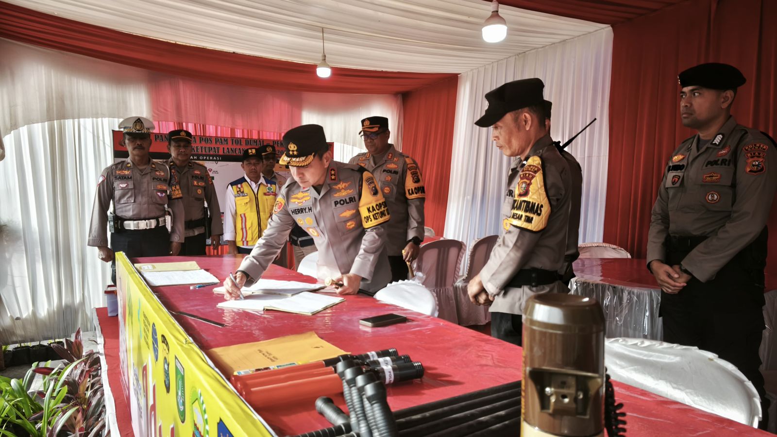 Dirlantas Polda Riau Kombes Pol Taufiq Lukman Nurhidayat mendampingi Kapolda Riau Irjen Pol Dr. Herry Heryawan dalam kunjungan ke Pelabuhan Pelindo Dumai, Pos Pengamanan (Pos Pam), Pos Terpadu, dan Pos Pam Gerbang Tol Dumai, Jumat (28/03/2025).