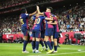 Para pemain Barcelona merayakan gol dalam laga final Copa del Rey melawan Real Madrid di Estadio de La Cartuja, Ahad (27/4/2025) dini hari WIB.