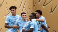 Pemain Manchester City merayakan gol yang dicetak oleh Phil Foden ke gawang klub Maroko, Wydad AC, dalam laga Grup G Piala Dunia Antarklub 2025 di Lincoln Financial Field stadium di Philadelphia, Kamis (19/6/2025) dini hari WIB.