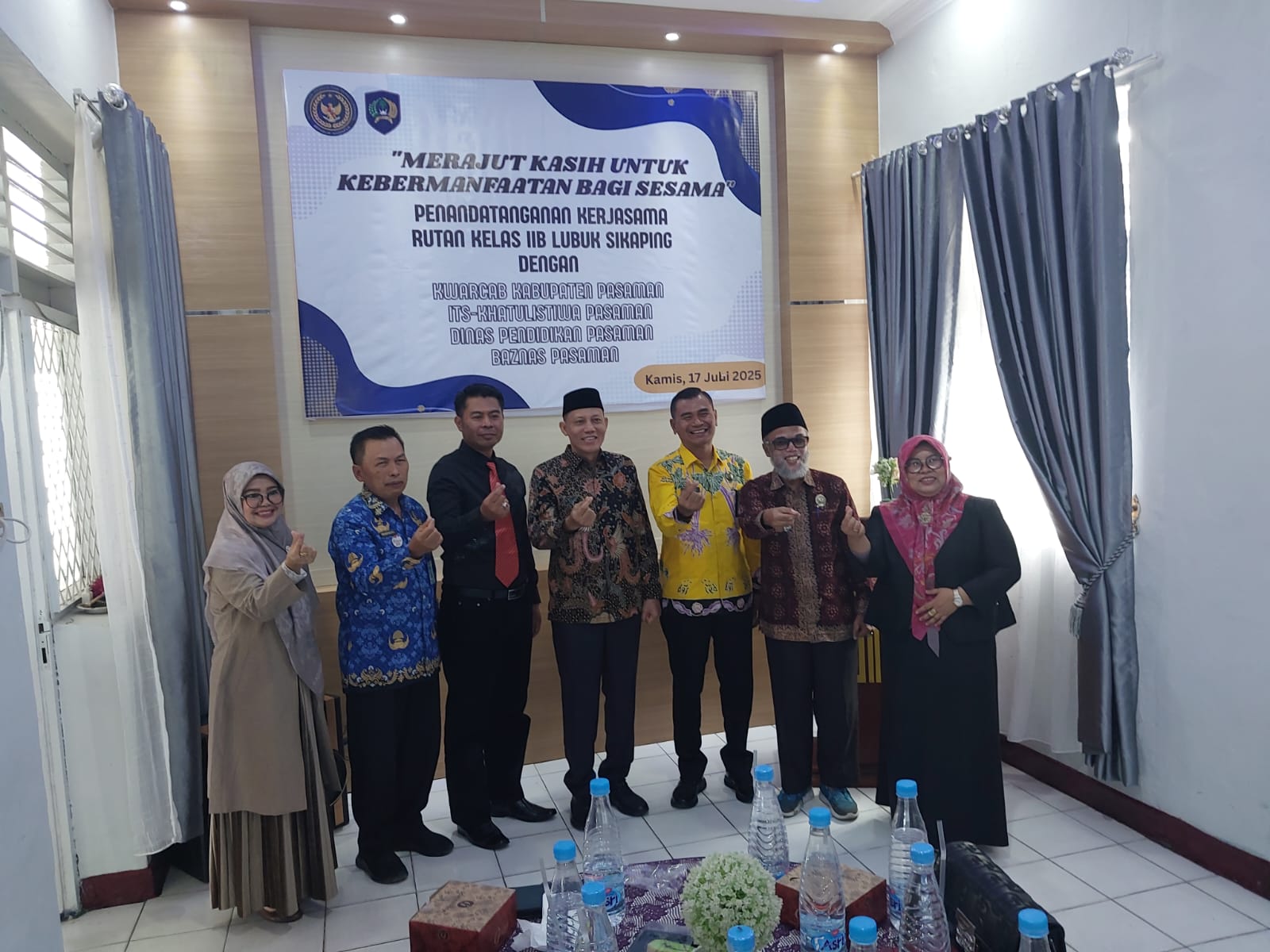 Foto bersama usai penandatangan MoU antara Rutan Kelas II B Lubuk Sikaping dengan Kwarcab Pramuka Pasaman, Dinas Pendidikan Pasaman, Baznas Pasaman dan IT'S Khatulistiwa Pasaman dii Lubuk Sikaping, Kamis (17/7/2025).