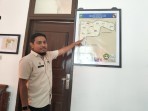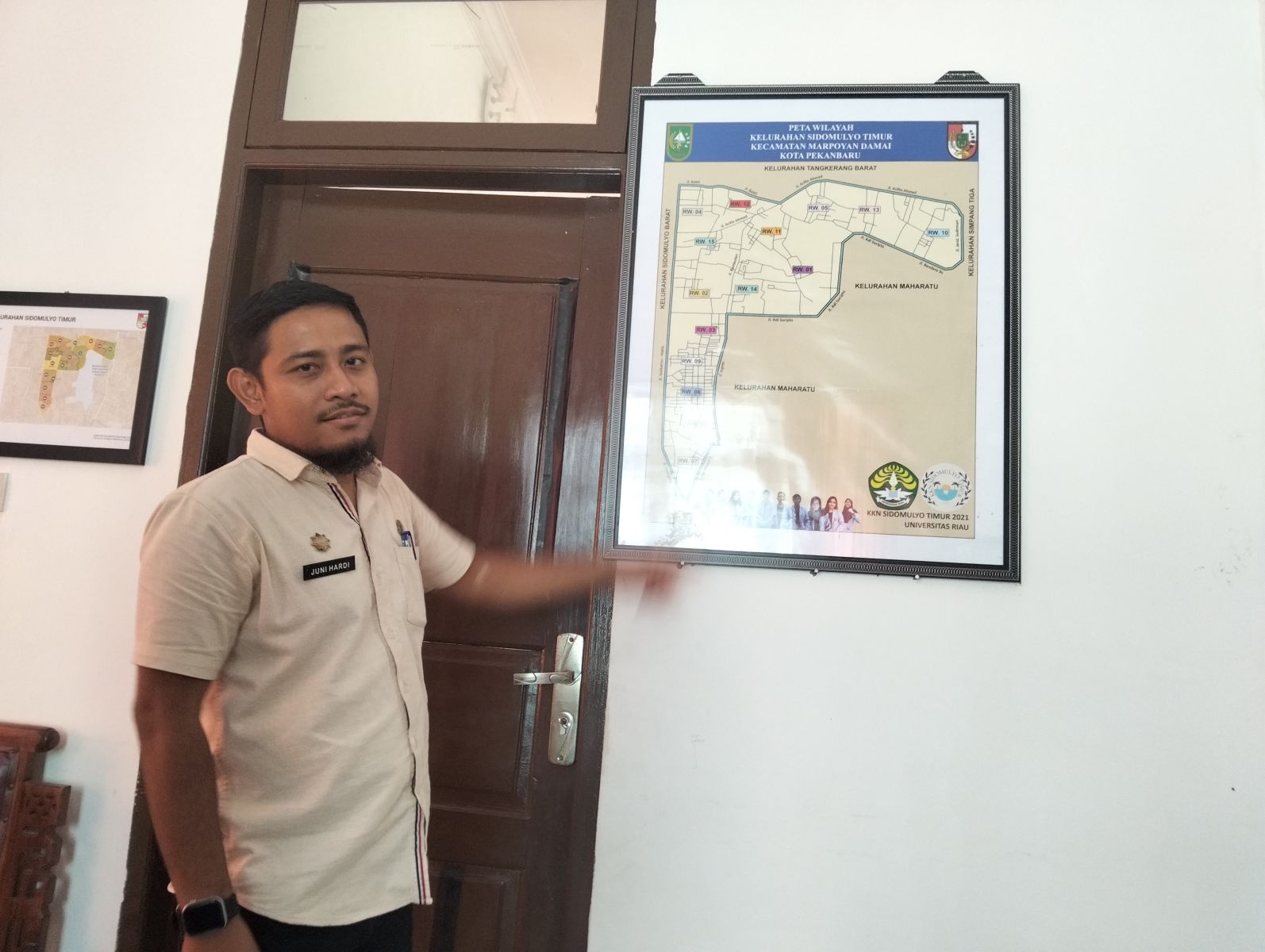 Plt Lurah Sidomulyo Timur, Kecamatan Marpoyan Damai Juni Hardi, SSTP saat menunjukkan peta lokasi di wilayahnya, Kamis (24/7/2025)