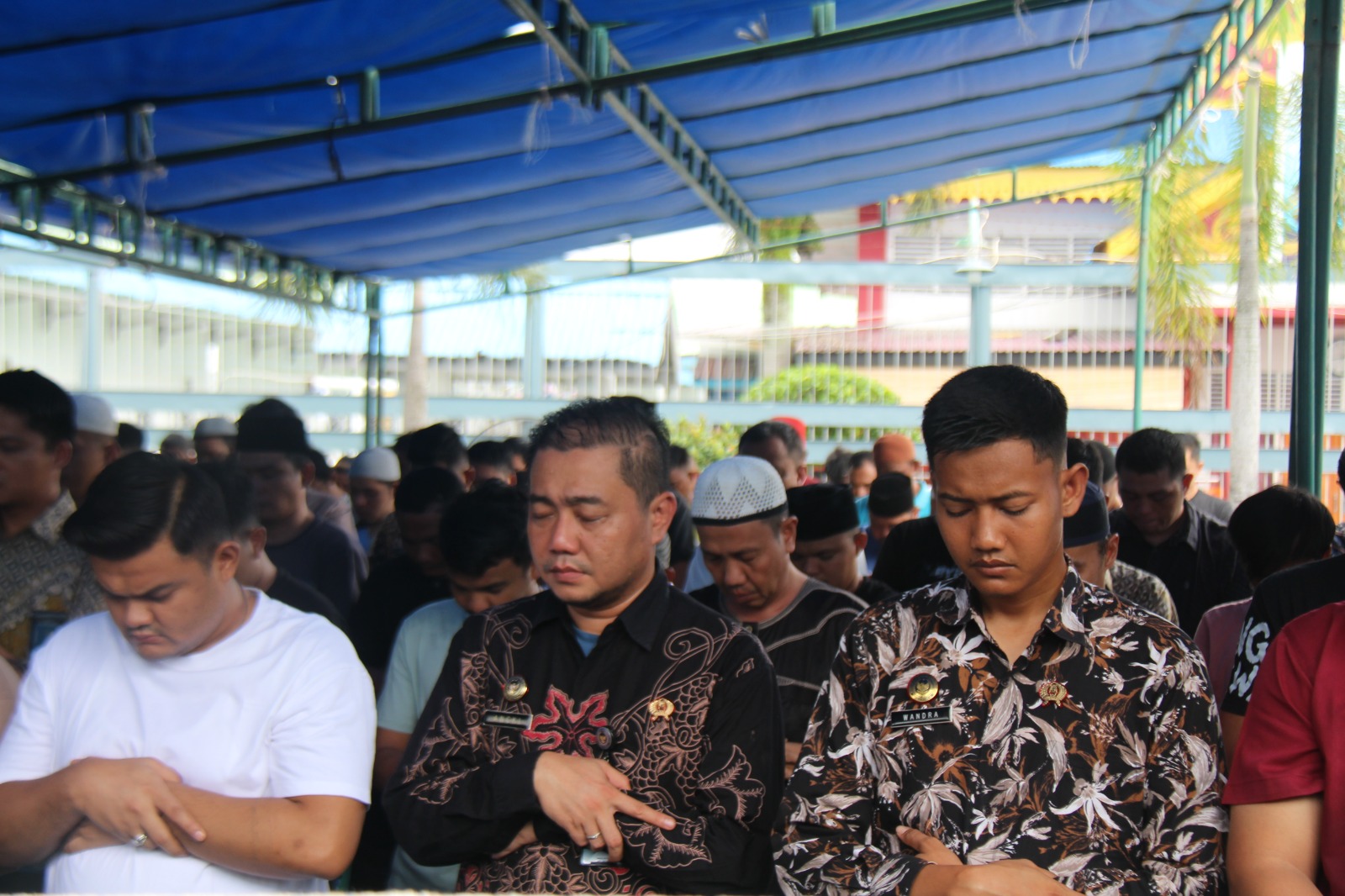 Ratusan Warga Binaan Pemasyarakatan (WBP) melaksanakan ibadah sholat Jumat berjamaah bersama Kepala Lapas Pekanbaru, Yuniarto, dan jajaran petugas Lapas Pekanbaru, Jumat (10/10/2025).