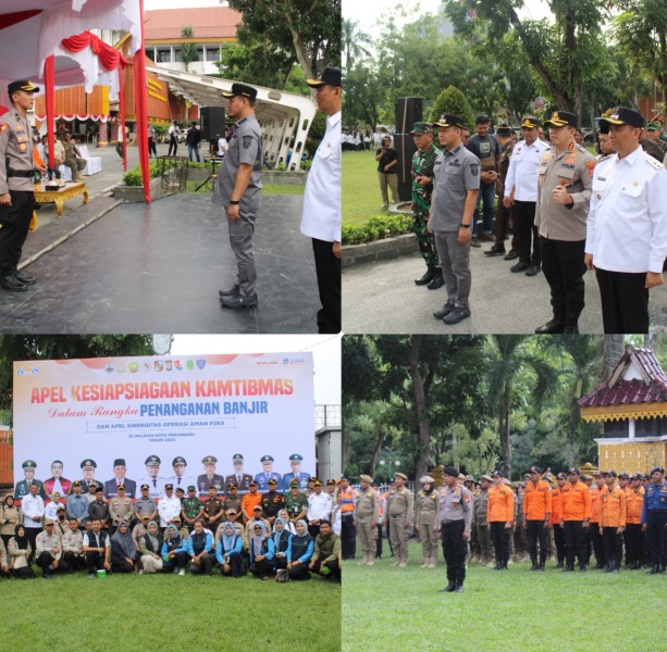 Kapolresta Pekanbaru Kombes Pol Jeki Rahmat Mustika, S.I.K., M.H hadir dalam Apel Kesiapsiagaan Penanganan Banjir dan Sinergitas Operasi Aman/P2KS Tahun 2025 yang digelar di Mall Pelayanan Pekanbaru (MPP) di Jalan Jenderal Sudirman Rabu (15/10/2025).