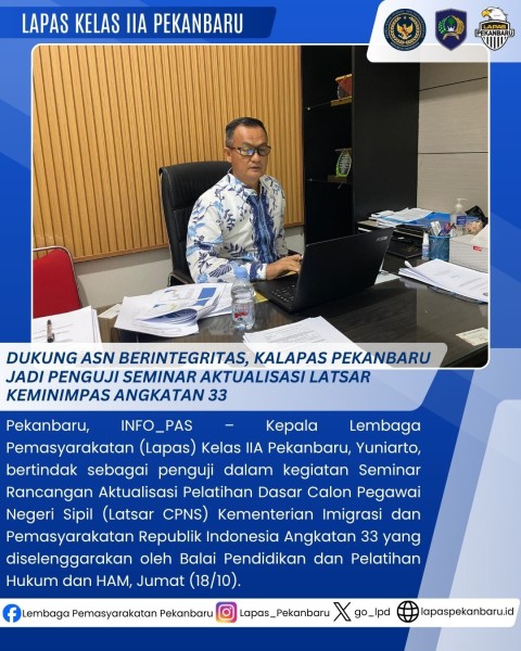 PEKANBARU--(KIBLATRIAU.COM)--Kepala Lembaga Pemasyarakatan (Lapas) Kelas IIA Pekanbaru, Yuniarto, bertindak sebagai penguji dalam kegiatan Seminar Rancangan Aktualisasi Pelatihan Dasar Calon Pegawai Negeri Sipil (Latsar CPNS) Kementerian Imigrasi dan Pemasyarakatan Republik Indonesia Angkatan 33 yang diselenggarakan oleh Balai Pendidikan dan Pelatihan Hukum dan HAM, Jumat (18/10/2025).