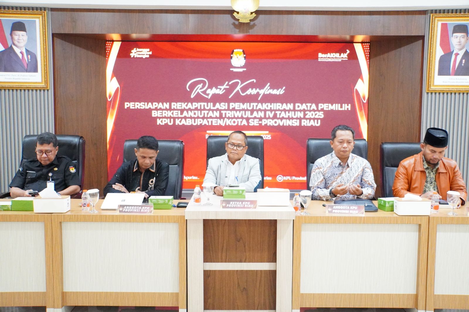 Komisi Pemilihan Umum (KPU) Provinsi Riau menggelar Rapat Koordinasi Persiapan Pleno Terbuka Rekapitulasi Pemutakhiran Data Pemilih Berkelanjutan (PDPB) Triwulan IV Tahun 2025, bertempat di Ruang Rapat Kantor KPU Provinsi Riau, Rabu (26/11/2025).