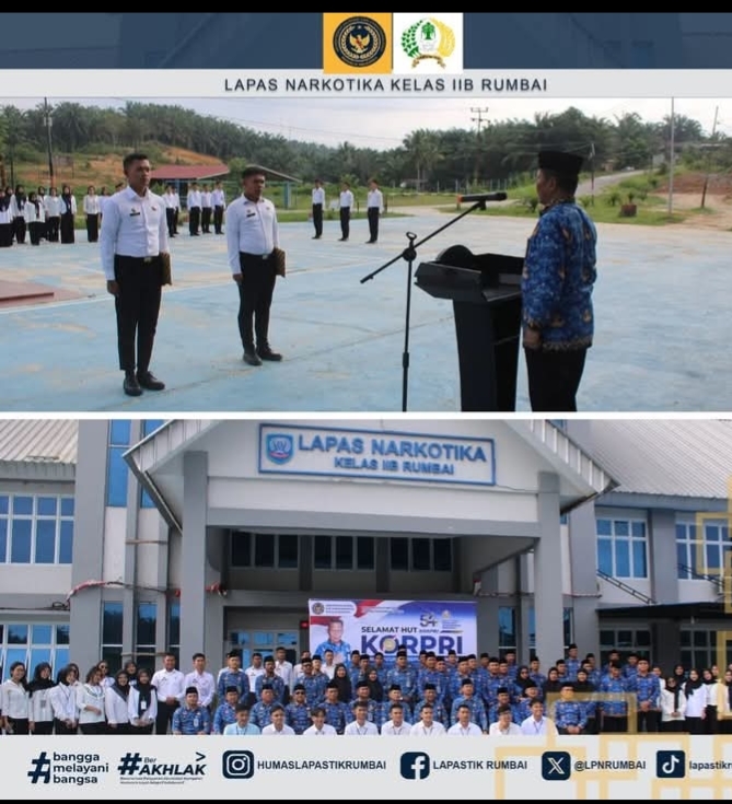 Upacara peringatan Hari Ulang Tahun Korps Pegawai Republik Indonesia (KORPRI) ke-54 tahun 2025 berlangsung khidmat di Lapas Narkotika Kelas IIB Rumbai pada Senin (01/12/2025).