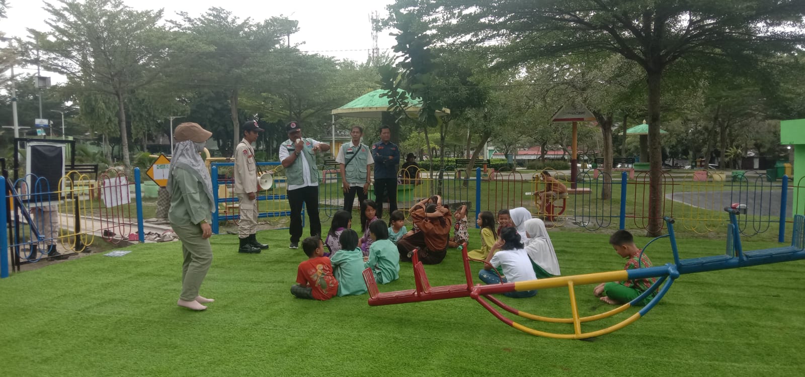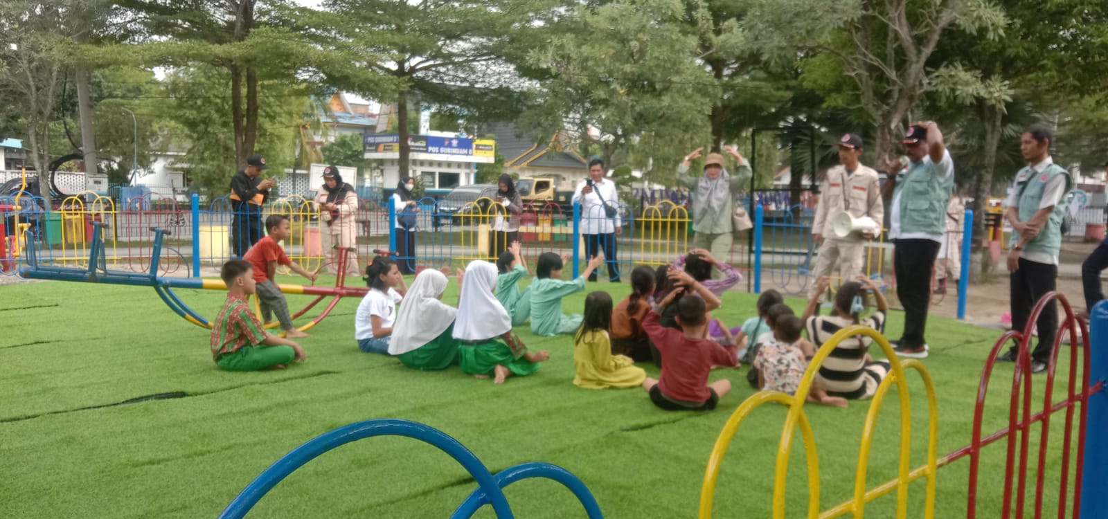 Sampai di RTH, Tim BPBD Pekanbaru mengajak anak-anak yang berada di sekitar RTH untuk berkumpul dan menyimak simulasi yang disampaikan oleh tim BPBD Pekanbaru.