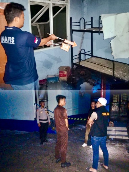 Personil unit Inafis Sat Reskrim Polres Pelalawan saat melakukan olah TKP di kebakaran mess RS Efarina, Sabtu (20/12/2025).