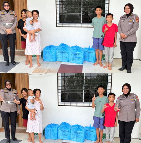 Selain penyerahan bantuan, Iptu Syuri Wulan beserta jajaran juga menyampaikan pesan-pesan edukasi terkait Kamtibmas, Kamseltibcarlantas, serta Green Policing.
