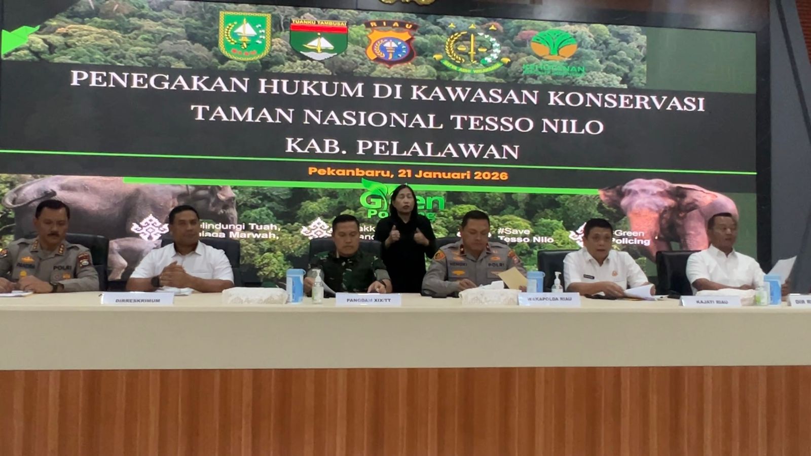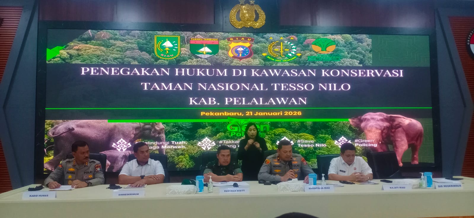 “Bekerjasama dengan Satgas TP 2 TNTN,  kami menjerat para tersangka dengan dua konstruksi tindak pidana, yakni pelanggaran Undang-Undang Konservasi Sumber Daya Alam (SDA) dan tindak pidana pengrusakan barang secara bersama-sama,” tegas Wakil Kepala Polda Riau, Brigjen Pol Hengky Hariyadi didampingi Kabid Humas Kombes Pol Zahwani Pandra Arsyad saat konferensi pers, Rabu (21/1/2026).