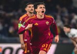 Pemain AS Roma Niccolo Pisilli melakukan selebrasi usai mencetak gol