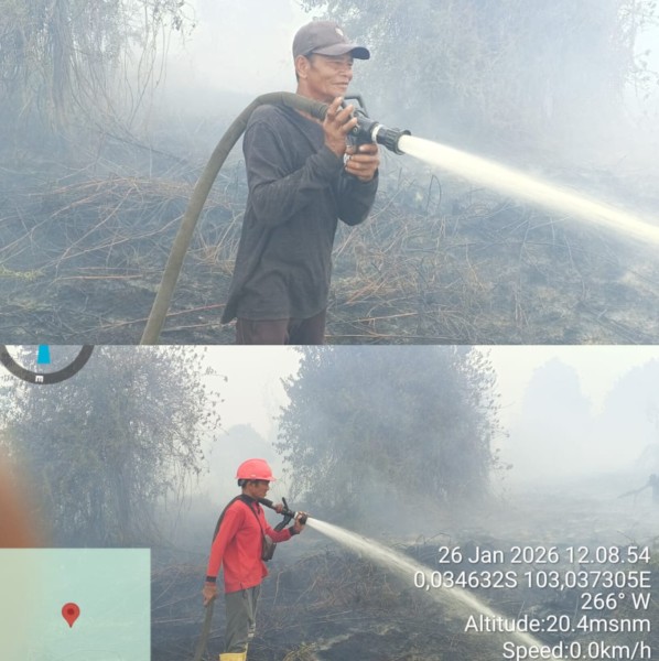 INHIL--(KIBLATRIAU.COM)-- Kapolsek Gaung AKP Edi Dalianto bersama Kanit Binmas Polsek Gaung, Ricci Ronaldy memimpin langsung pemadaman kebakaran hutan dan lahan (karhutla) yang terjadi di Desa Simpang Gaung, Kecamatan Gaung, Kabupaten Indragiri Hilir (Inhil), Kamis (29/1/2026) lalu