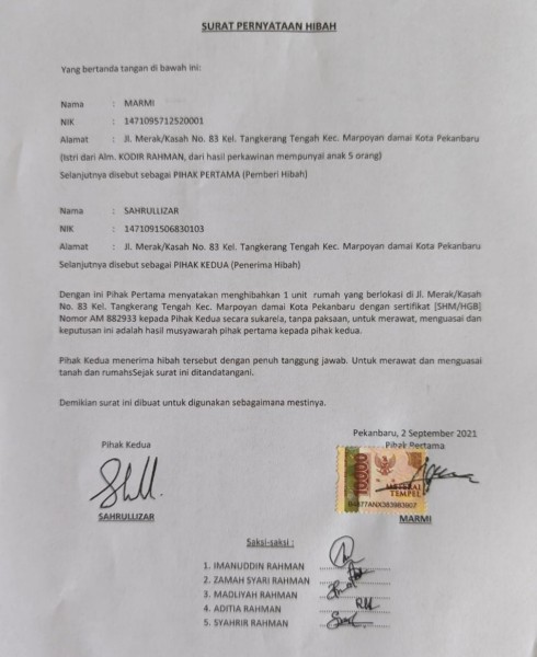 PEKANBARU--(KIBLATRIAU.COM)-- Saat ini, kisruh pemilihan Ketua RT/RW di wilayah RW 02 Kelurahan Tangkerang Tengah, Kecamatan Marpoyan Damai belum berkesudahan. Pasalnya,, munculnya surat hibah rumah dari salah satu calon yang kini telah menjadi Ketua RW 02 terpilih tuai masalah baru bagi masyarakat, karena surat hibah tersebut diduga Aspal (asli tapi palsu).