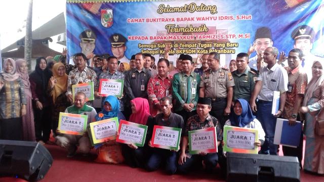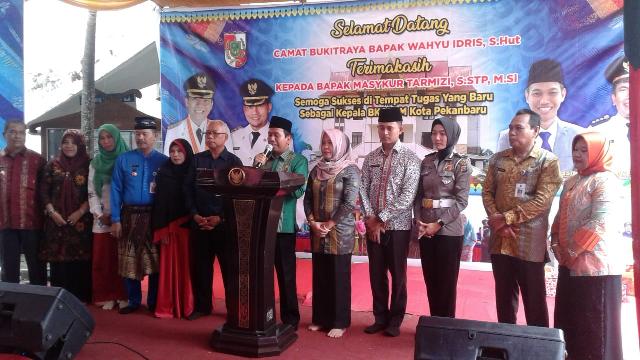 PEKANBARU--(KIBLATRIAU.COM)-- Posisi Camat Bukitraya saat ini resmi dijabat Wahyu Idris Shut. Ia mengantikan camat lama yakni, Masykur Tarmizi. Usai dilantik beberapa waktu lalu, maka pihak Kecamatan Bukitraya melaksanakan acara pisah sambut sekaligus pengkuhan pengurus LPM, Kamis (7/2). Pada acara itu, ratusan masyarakat yang ada di Kecamatan Bukitraya turut hadir. Selain itu, hadir juga Staf Ahli Pemko Pekanbatu yang diwaikli Mulyasman , Kapolsek Bukitraya, Danramil, LPM, forum RT/RW, LPM Karang Taruna dan kader PKK Kecamatan/Kelurahan serta tamu undangan lainnya.